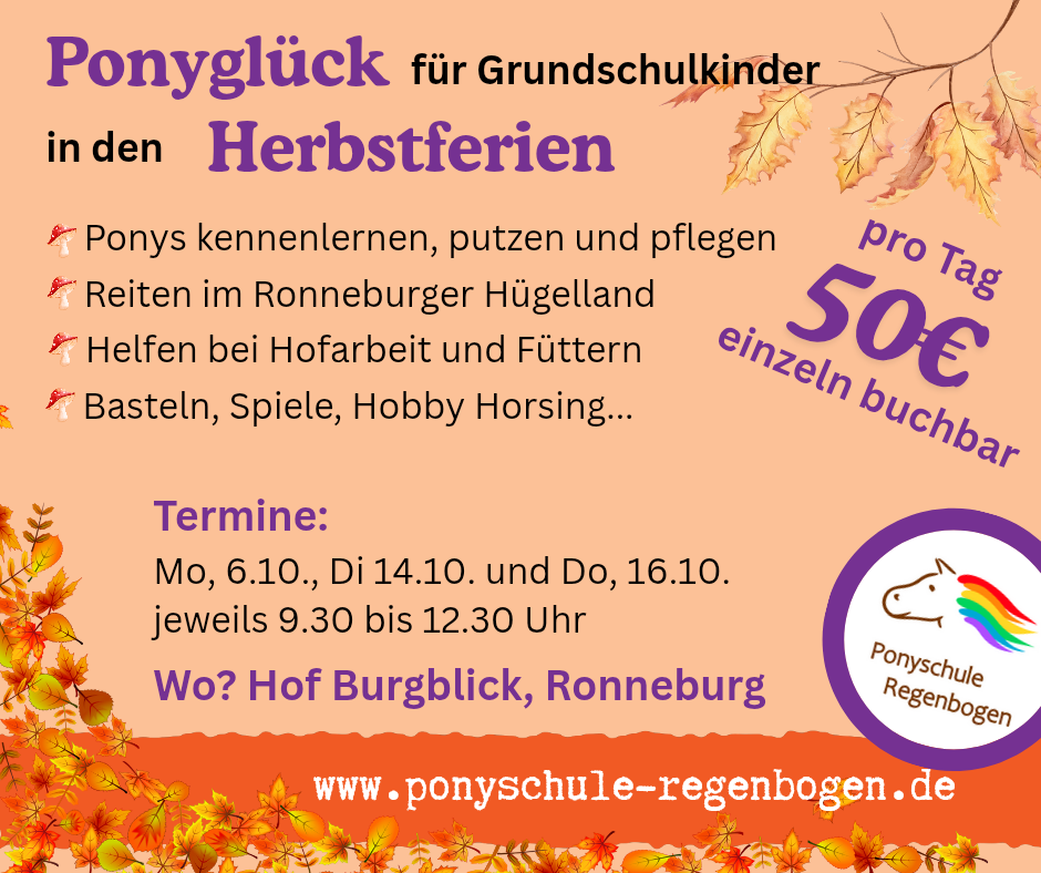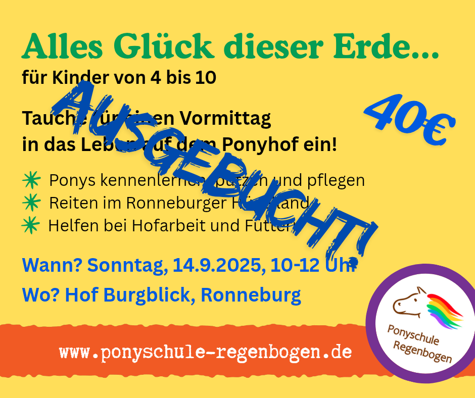 Die Ponyschule Regenbogen hat ihr neues Zuhause in 63549 Ronneburg auf Hof Burgblick gefunden. Hier wächst eine moderne Reitanlage, die der Ponyschule, vor allem aber unseren Pferden, beste Bedingungen bietet. Wir freuen uns auf euren Besuch (bitte mit Anmeldung)!
