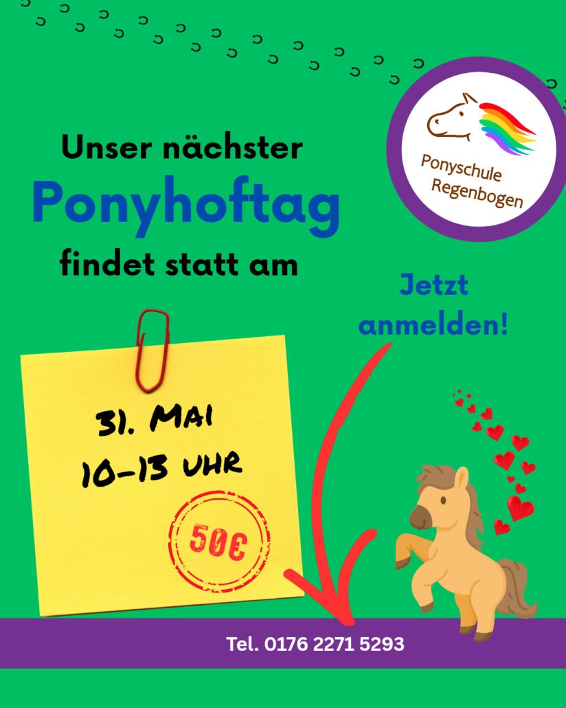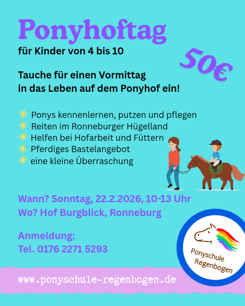 An unseren Ponyhoftagen laden wir alle Kinder zwischen 4 und 10 Jahren ein, einen Vormittag bei uns auf dem Ponyhof zu verbringen. Während des dreistündige Programms ist ausreichend Zeit, unsere Pferde kennenzulernen, zu striegeln und geführt im Schritt zu reiten. Gemeinsame Hofarbeit und ein pferdiges Bastelangebot runden den Vormittag ab. Als Erinnerung erhält jedes Kind eine kleine Überraschung. Kindergartenkinder können eine Begleitperson mitbringen. Die Teilnahme kostet 50€ pro Kind.